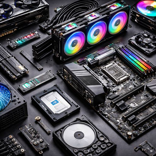 peças de um computador, como o processador, Placa Principal, a memória RAM, os discos, placa gráfica e monitor.